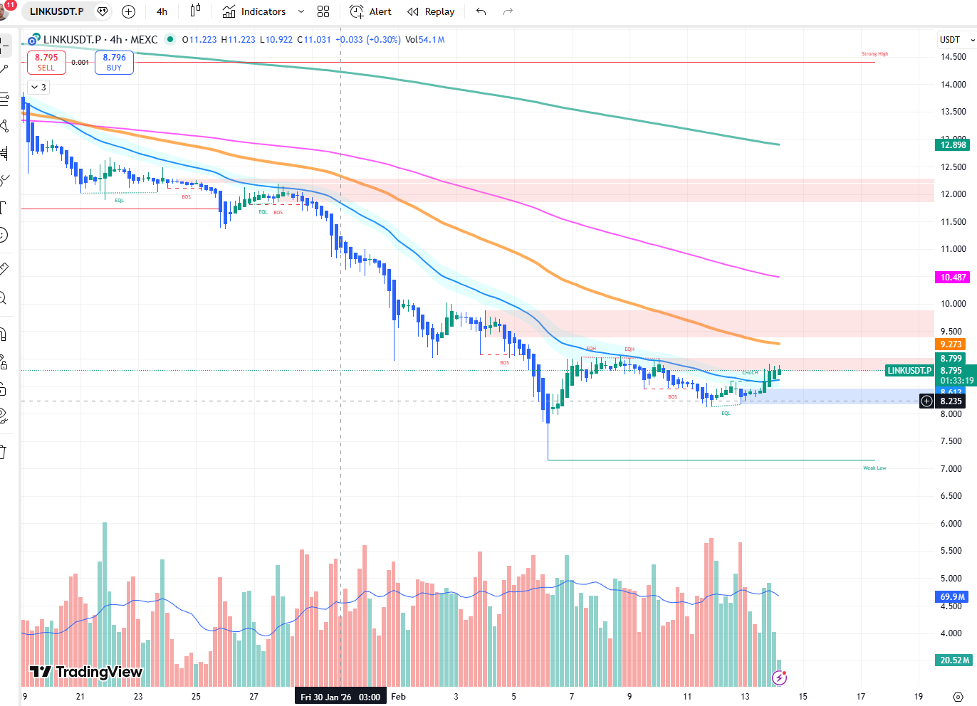 - Giá nằm dưới toàn bộ EMA/MA quan trọng, đặc biệt MA dài (đường xanh lá phía trên).