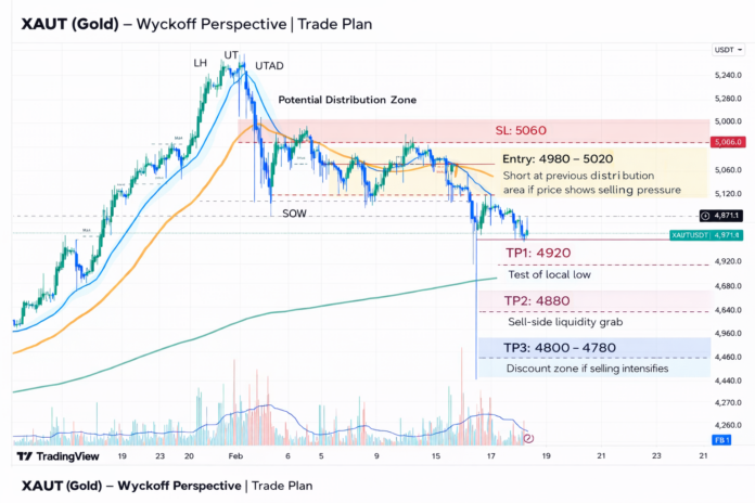 Ở chiều ngược lại, nếu kịch bản markdown tiếp diễn, mục tiêu đầu tiên là khu vực 4,920, nơi giá đã từng phản ứng trước đó. Xa hơn, vùng 4,880 là nơi tập trung sell-side liquidity và có khả năng được test lại. Trong trường hợp áp lực bán mở rộng, vùng 4,800 – 4,780 sẽ là mục tiêu sâu hơn, tương ứng với vùng discount của cấu trúc hiện tại.