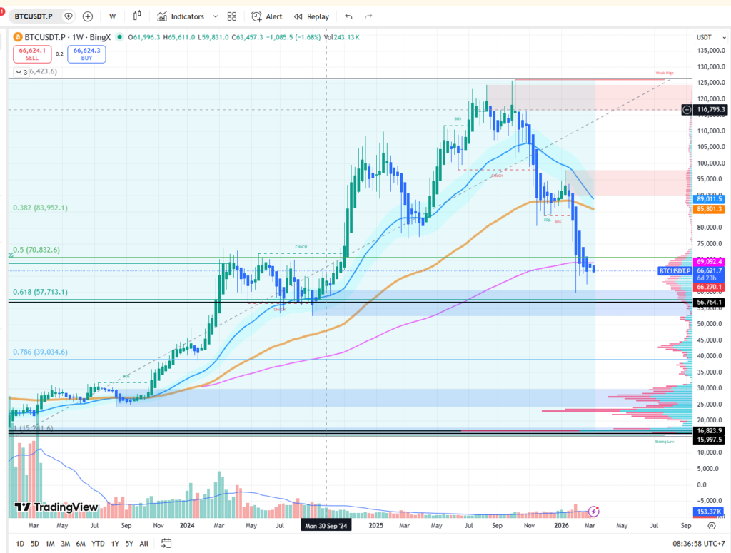Nếu nhìn theo logic thanh khoản của Smart Money Concepts, Bitcoin vẫn còn một khu vực cực kỳ hấp dẫn phía dưới: 56.000 – 58.000 USD. Đây là vùng demand quan trọng, nơi thị trường từng tích lũy trước khi bùng nổ trong chu kỳ tăng trước. Ngoài ra, khu vực này cũng trùng với vùng Fibonacci sâu của toàn bộ xu hướng tăng.